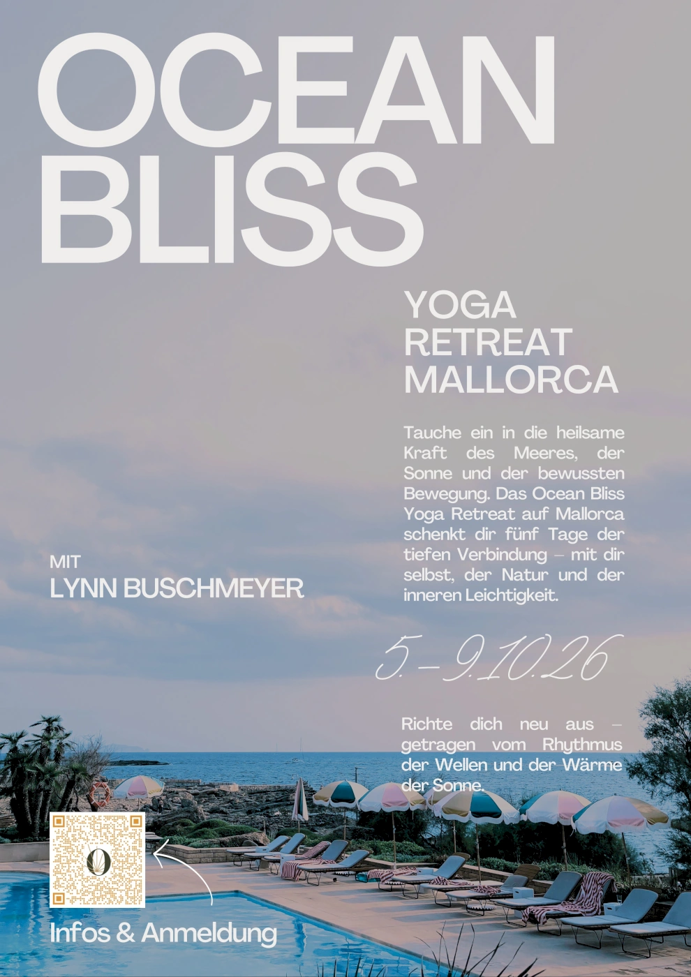 Tauche ein in die heilsame Kraft des Meeres, der Sonne und der bewussten Bewegung. Unser Ocean Bliss Yoga Retreat auf Mallorca schenkt dir fünf Tage der tiefen Verbindung – mit dir selbst, der Natur und der inneren Leichtigkeit. Inmitten mediterraner Schönheit erwarten dich tägliche Yogaeinheiten bei Meeresrauschen und Sonnenlicht.